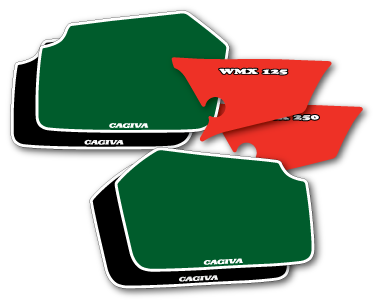 Sidepanel and plates for ’86-’87 Cagiva 125/250. Includes sidepanel with cc but no front plate.